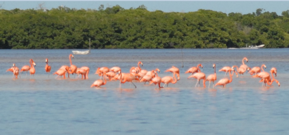 We had a great day in Celestun today. We woke early for breakfast at the Hotel Hacienda de Merida to hop on a tour bus headed west to the sea. We saw some beautiful things and some pretty villages. We later got on a boat and toured the mangroves, saw nests of termites and were warned of crocodiles and boas. It was beautiful. We saw the flocks of pink flamingos (do they come in other colors?). We were told how they come to become pink – there is a worm they eat that turns them pink (they begin life white).