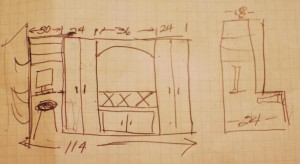 It might be hard to discern the details of the idea from the photo above. The center portion is a bar (the Xs is a wine rack), the left and right of the bar area are pantries and the area on the far left is a little work station. I really like this idea and the plan is to adopt it going forward (subject to change on a pretty regular basis of course).