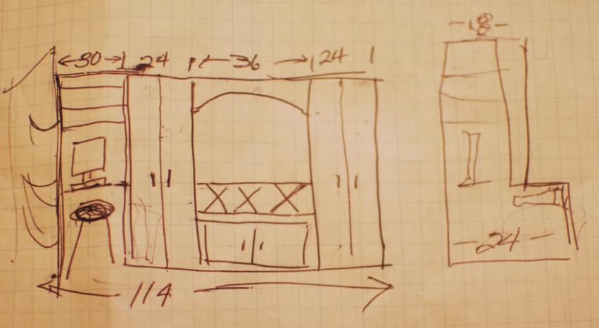I like the idea of having a little bar area in the kitchen. So I was sharing this idea with Tavo today and he added some ideas I really liked a lot. It took the form of this draft: