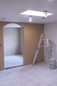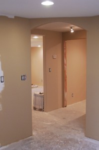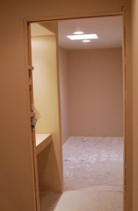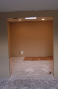 This was taken inside the kitchen facing the opposite direction as the kitchen photo above. It faces the living room and the hallway/entrance to the master bedroom. You can’t quite tell from the photo below, but in addition to the sheet rock, we added a 3/4″ sound deadening material to all exterior walls and to the interior walls. Each room is mostly sound proof.