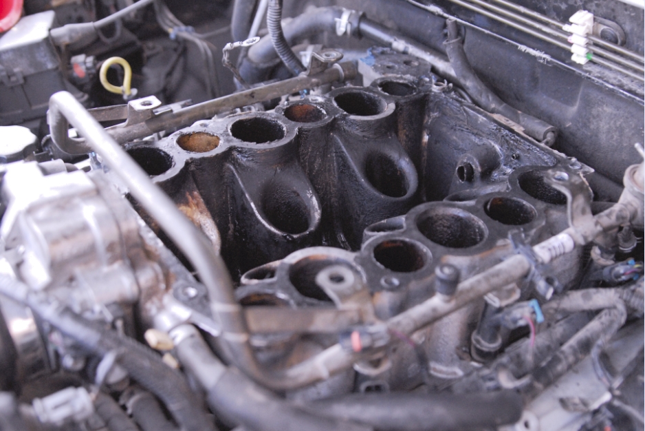 Once cleaned, I re-installed them (I was Alix’s helper today). The intake manifold also was saturated with thick carbon. I took the power sprayer to it which proved highly effective.