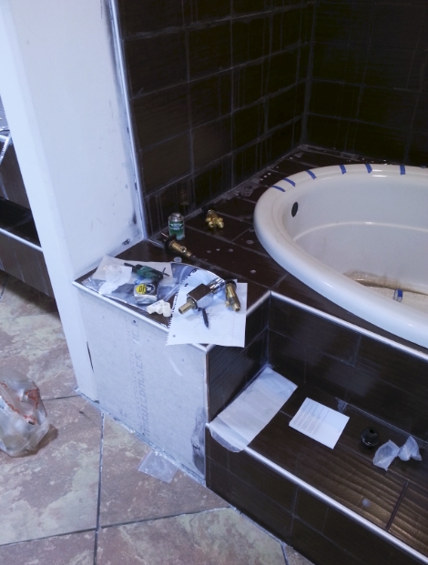 It’s going on 5pm. I started at 8am. I’m not used to standing all day. I didn’t work that hard, but I am pretty tired. There is a chance, perhaps slim, that the bathtub will be installed tomorrow, along with the sinks. That would be nice.