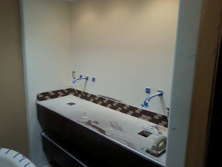 A couple weeks ago Tavo installed the vanity, the tile on the vanity, the back splash, the faucets, and then the cement board and texturing on the wall. I just sanded the walls and ingested a couple pounds of the wall. Mmmh. Now to clean my mess, prime, and paint. I think I will leave these walls white to contrast the brown on the opposing walls.