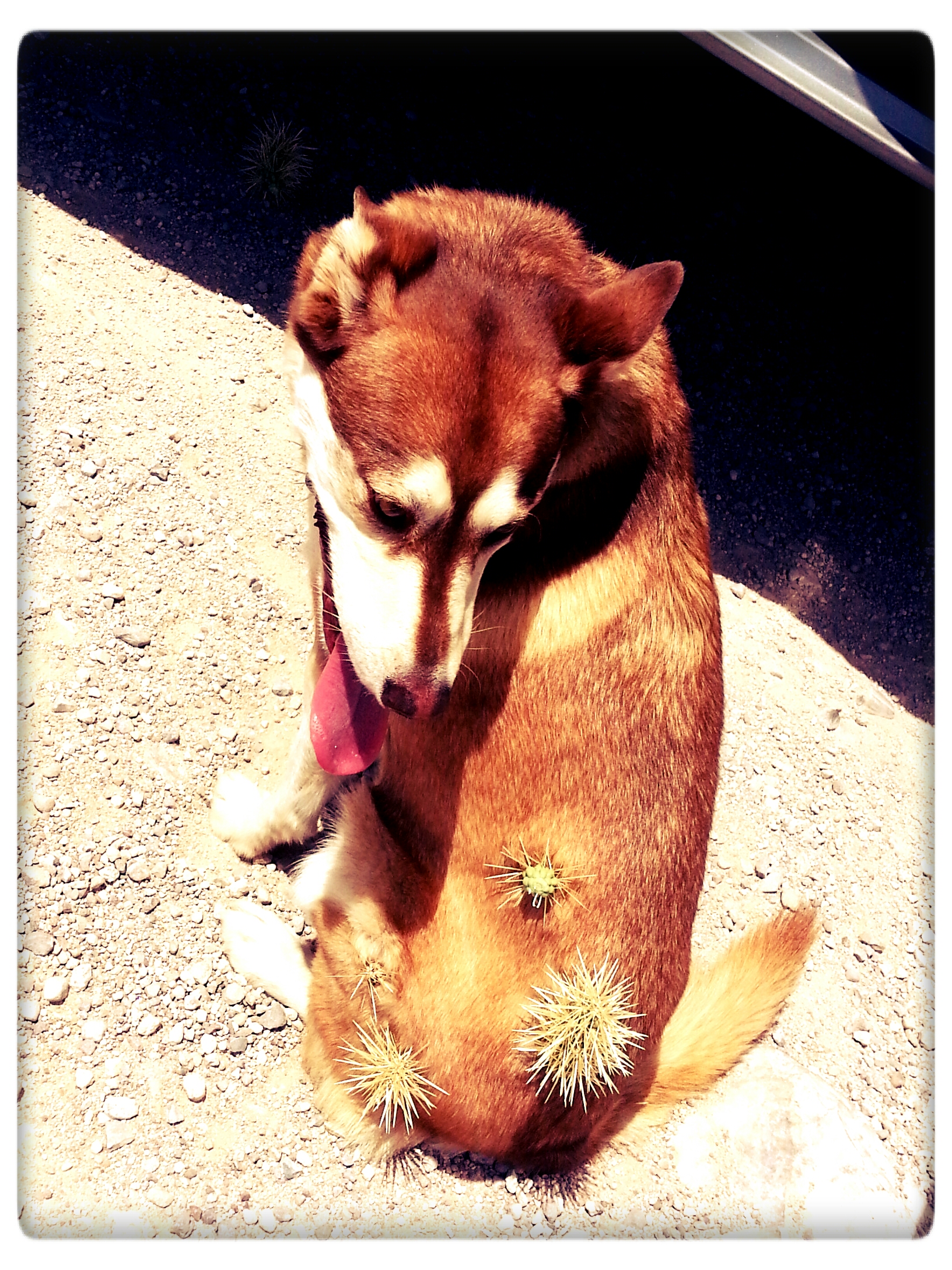 Scout is very fast and does not deviate from the road. Tila is not as fast and loves to explore off the road. This is a problem because we’re in the desert. Despite her previous history from suffering miserably from cactus needles, she does not learn to avoid them. Yesterday was no exception. Five minutes into the run, she deviated off the road and through a patch of la cholla cactus (also known as jumping cactus). The result was that she was covered in thorns, all over her face and body. And as I had nothing to remove them with, most of them ended up sticking to my hand as I tried to remove them.