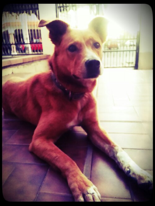 Happy to be back home, even though it is rather hot. Scout and I are enjoying the sunset from the front yard.