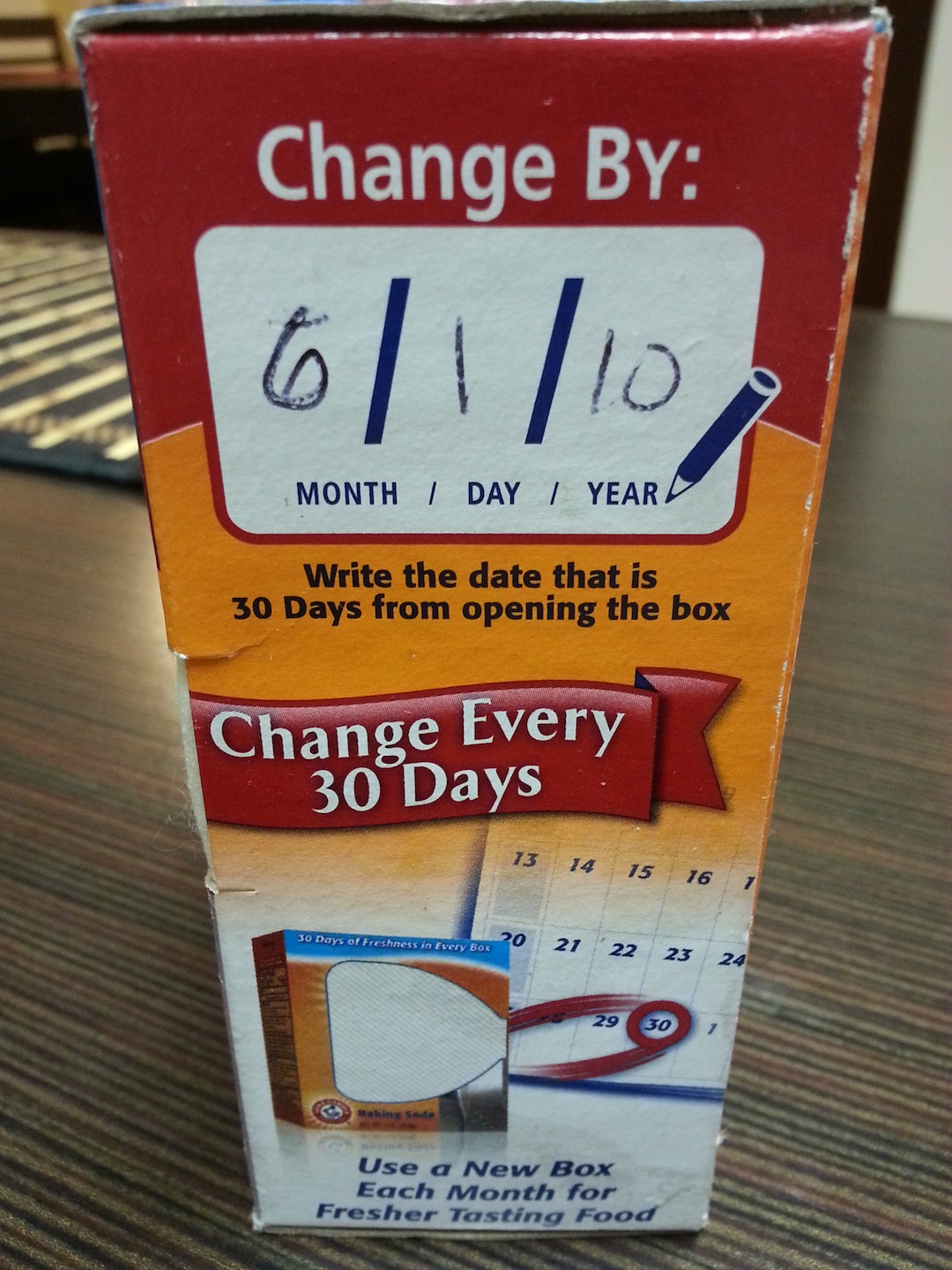 Apparently the baking soda in the fridge is to be changed every thirty days, not every three years. Easy mistake.