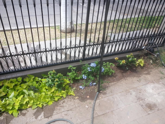 I planted five plants today among the ivy. The blue one in the center is a Plumbago (plumbago auriculata). Next to it on each side are two Citronella plants. They smell spectacular and I thought they might work as a helpful mosquito repellant. From what I’ve read online though, they have no benefit for that. Apparently it is the Citronella grass that is effective in doing that. Bummer. At least they smell great.