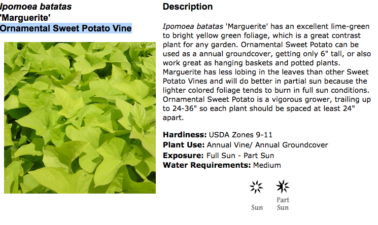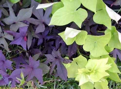 The above photo looks like a perfect match of both variants that I have. However, these vines are supposed to produce sweet potatoes (even the ornamental variety). I haven’t had them too terribly long (perhaps 4-5 months now) and I’ve not seen anything like a potato forming. Supposedly this is something that occurs in the fall though.