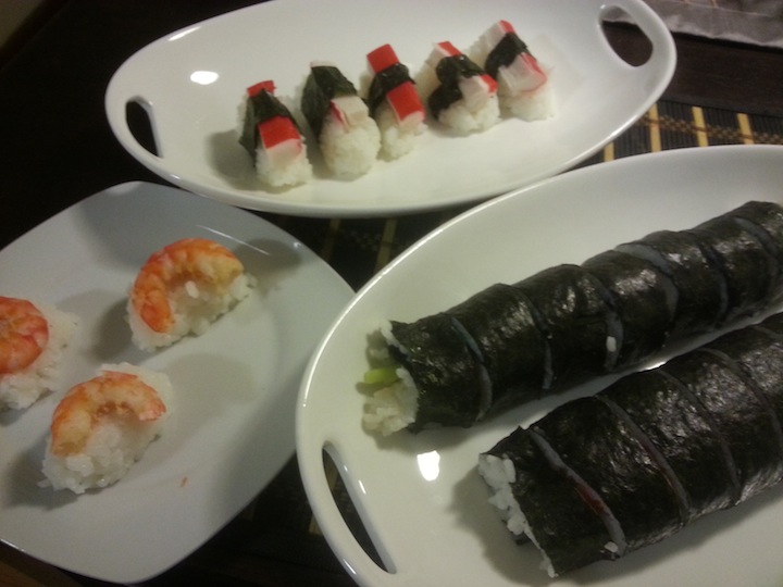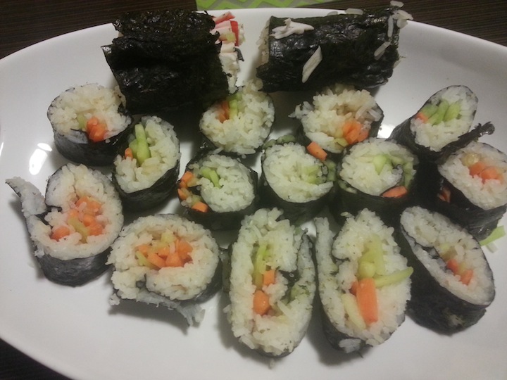 Yun then made an attempt the next day. She used the right sort of rice and the right sort of wrap. And as such, a much pretty roll. We made vegetable rolls, crab rolls, and shrimp rolls. All in all, pretty good. She also used a better knife to cut the rolls as the one that I used. Success.