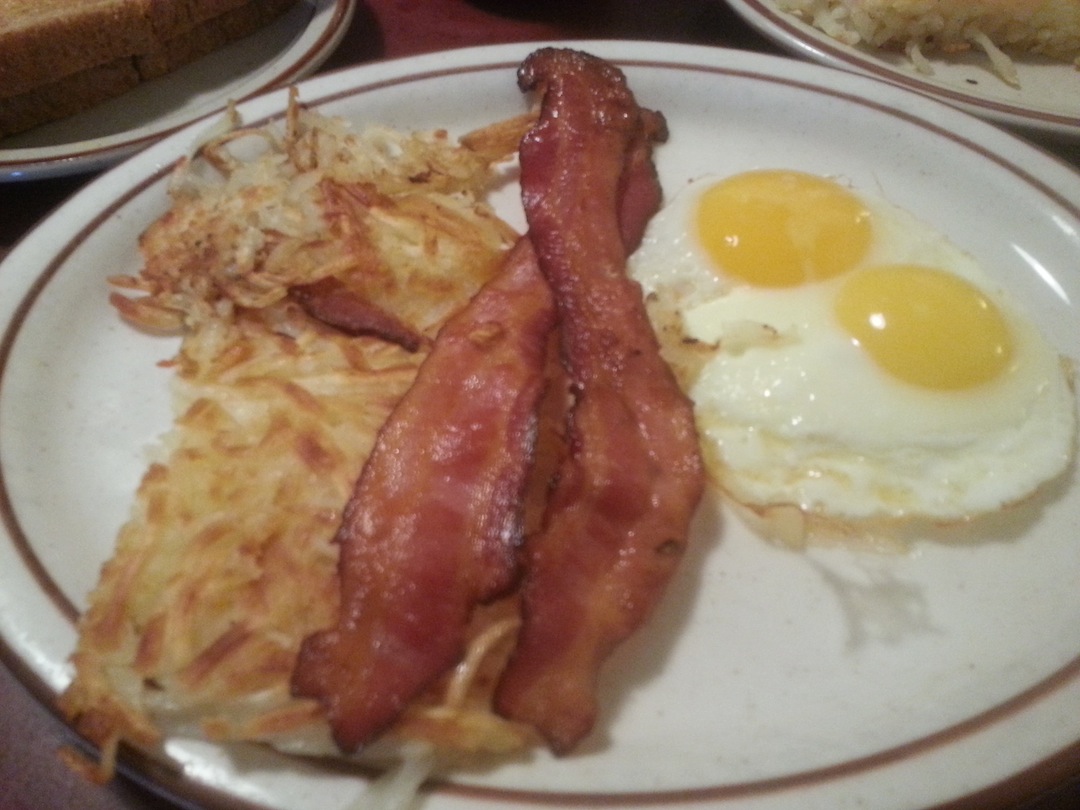 Two eggs sunny side up. Double hash browns. Bacon. Wheat toast. And coffee. It was so great.
