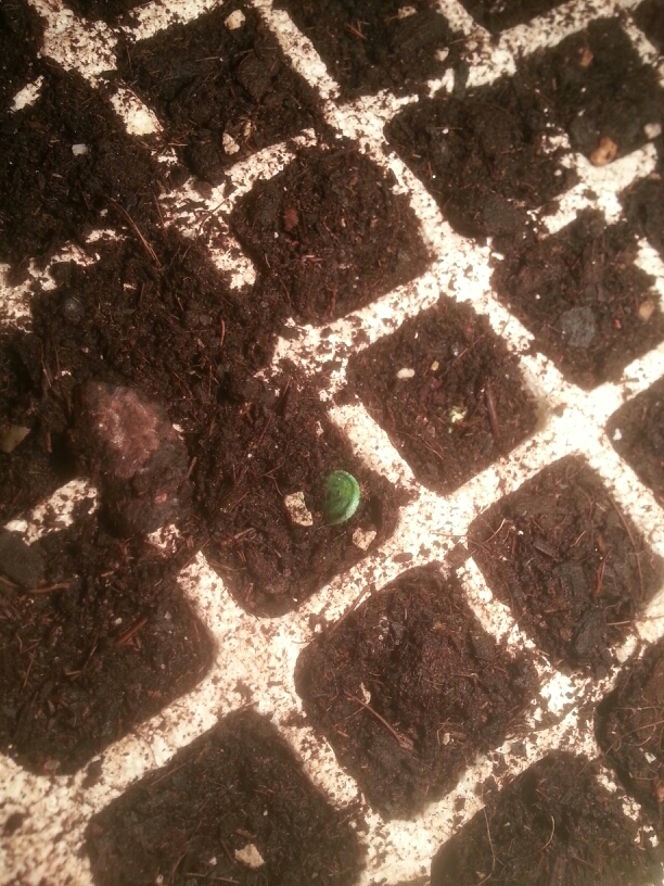 Below is one calabaza (this is the word for pumpkin and squash, so I don’t exactly know what I am getting) poking through the soil. It looks like a pumpkin seed, so perhaps that’s what it is.