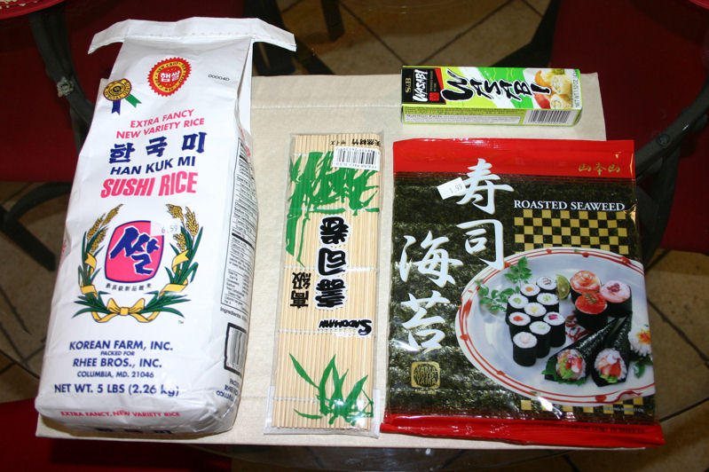 Above are the items we purchased to complete this experiment. From the left to right: Korean sushi rice, a sushi rolling mat, Yama Moto Yama roasted seaweed, and S&B wasabi.