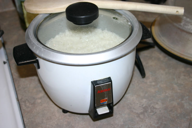 Step 1 is to begin making the rice as it takes the longest. I used a rice cooker that my mom bought me over a decade ago while in college. It still works like a charm and we use it a lot. I put 1 cup of rice to a cup and a half of water. The rice smelled a little funky initially, but that eventually went away and it tasted great.