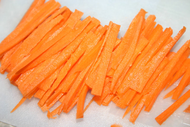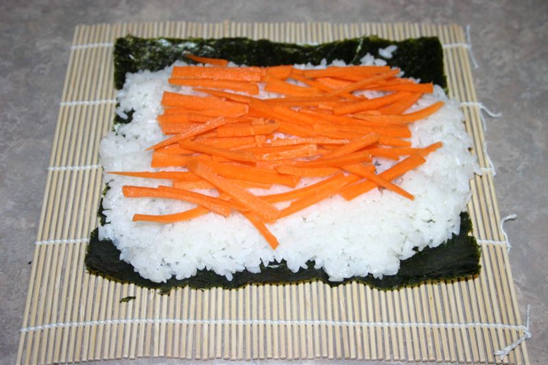 I became aware at Step 4 that I had cut the carrots wrong. They should be as long as the roll is wide, which ultimately would have made my rolls a lot cleaner looking. At any rate, this is the stage where you add your contents.