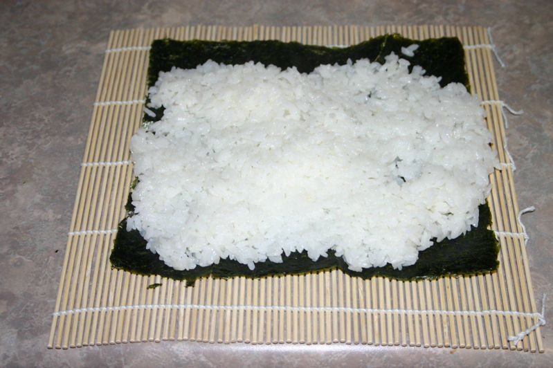 Step 3 was to roll out the bamboo mat and lay down the dried seaweed nori (with the shiny side down). The instructions were to lay 2 cups of cooked rice, but I had no idea to measure the quantity of rice, so I just added 75% of the rice from the rice cooker. This seemed to be an appropriate amount of rice.