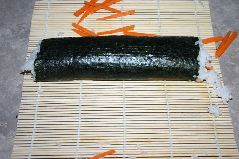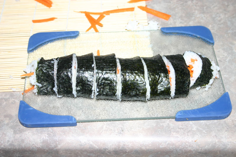 Step 2 was to prepare the contents of the rolls. In this case, I couldn’t find anything in the house that I would normally find in a roll. I was hoping to make cucumber rolls, but since we didn’t have any, I cut up some carrots instead. Having no instruction, I cut them wrong. As the photo above shows, they are way too short. They should have been double or triple that in length, but the thickness was appropriate.