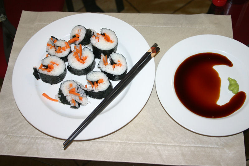 Despite their ugly appearance and the unusual use of carrots, these rolls were really quite good! Yunuen and I went out for sushi in Mexico a few months ago and they had jalapeno rolls – so perhaps that will be incorporated in the next attempt.