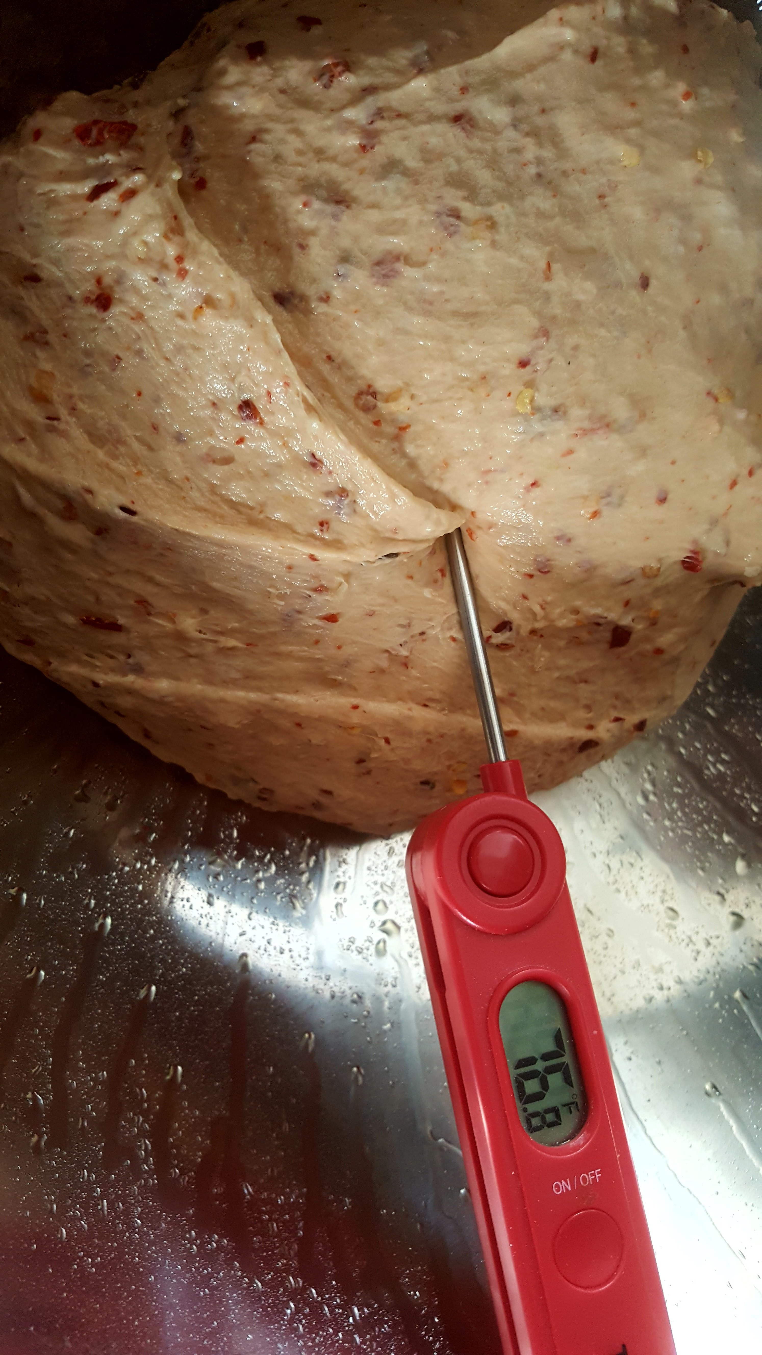 So I attempted to raise the temperature by putting the bowl outside. After about 2 minutes, the dough temperature move from 60 to 77. I brought the bowl back inside, in fear that it would get too hot. As a result, the dough temperature lowered again back to 73.