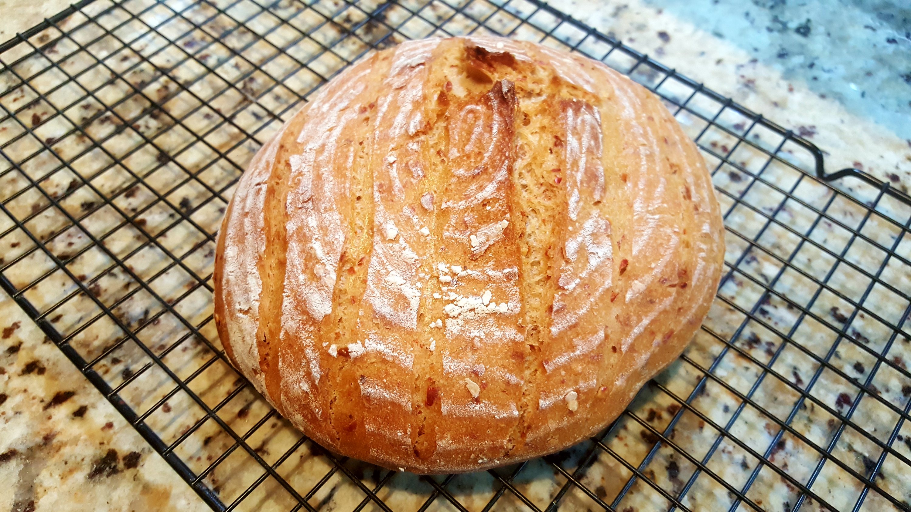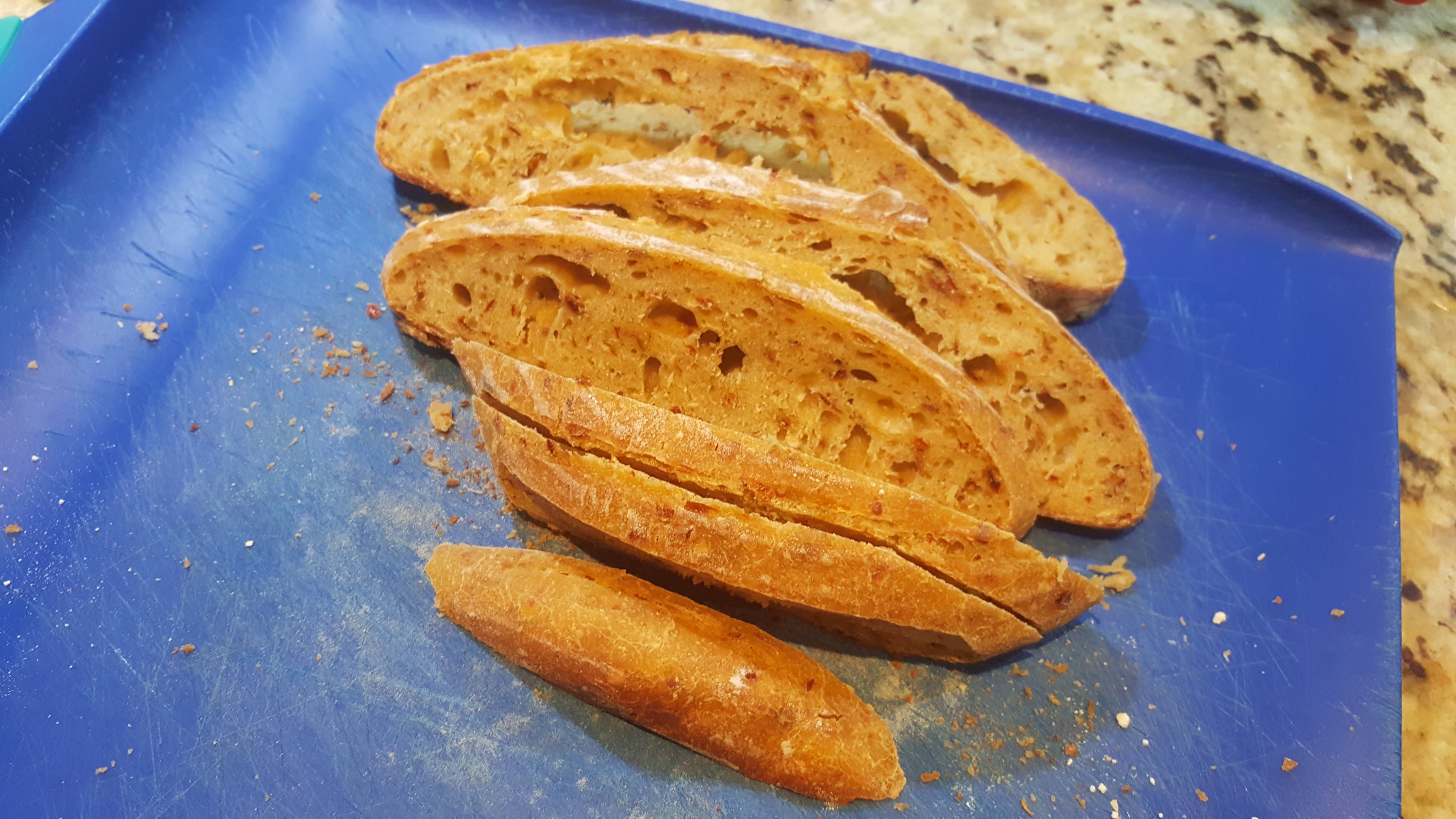 This bread was barely edible it is so incredibly hot. My eyes were watering and my mouth scortched. This will probably appeal to a beer-drinking context with guys that like it really hot. The pepper itself has a smokey taste and it a nice distinctive to chiltepin. The bread turned a darker hue, somewhat reddish.