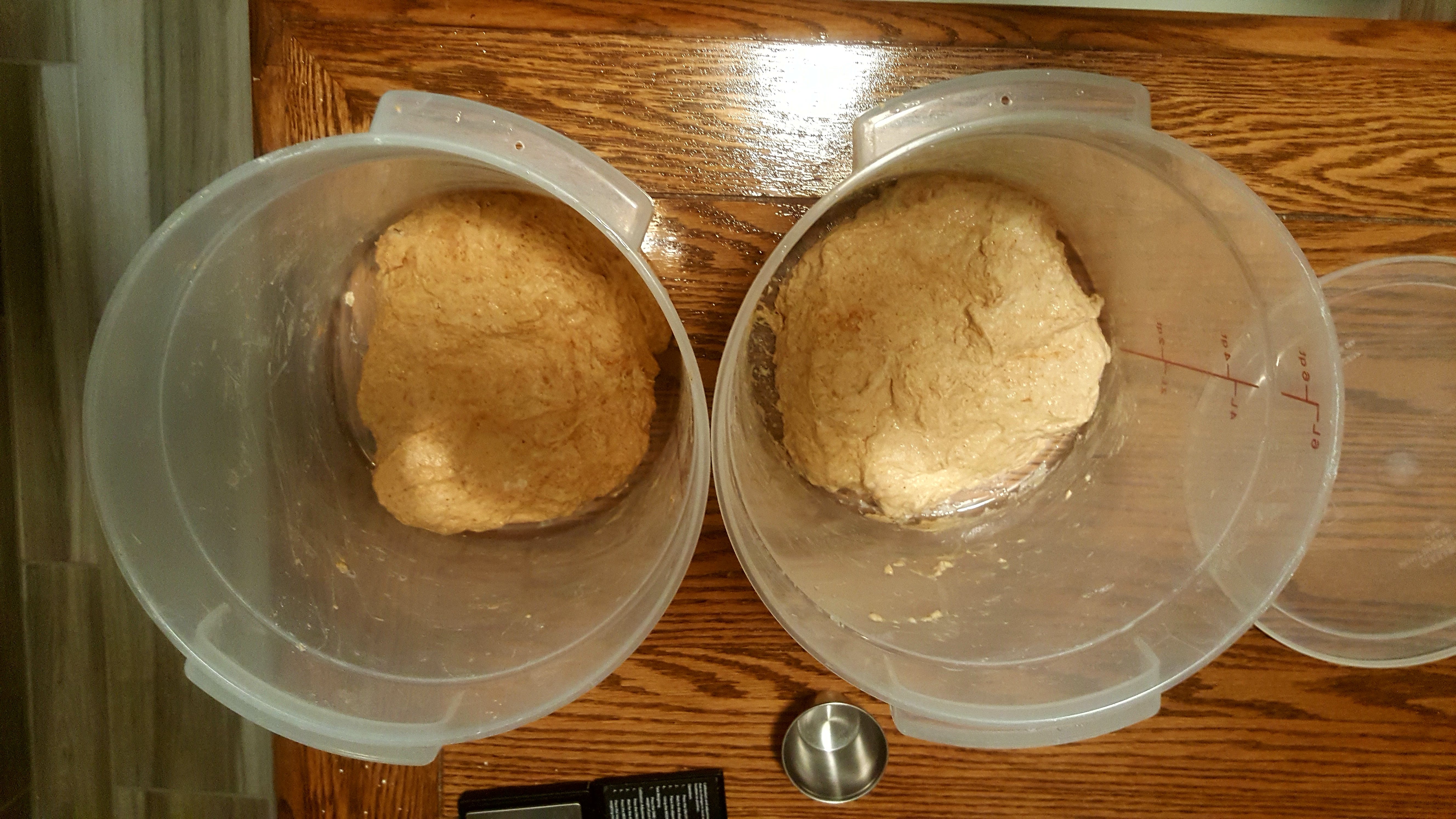 My personal preference is scorching hot bread. But I’ve been cautioned that will likely not sell well, so I’ve tried to minimize the impact of the chilies. I’ve been adding about 2% per loaf, but I’m trying to second batch this evening with 4%. The 4% batch is noticeably redder, but I don’t think it will be significantly more spicy. They will sit in these tubs for 15 hours.