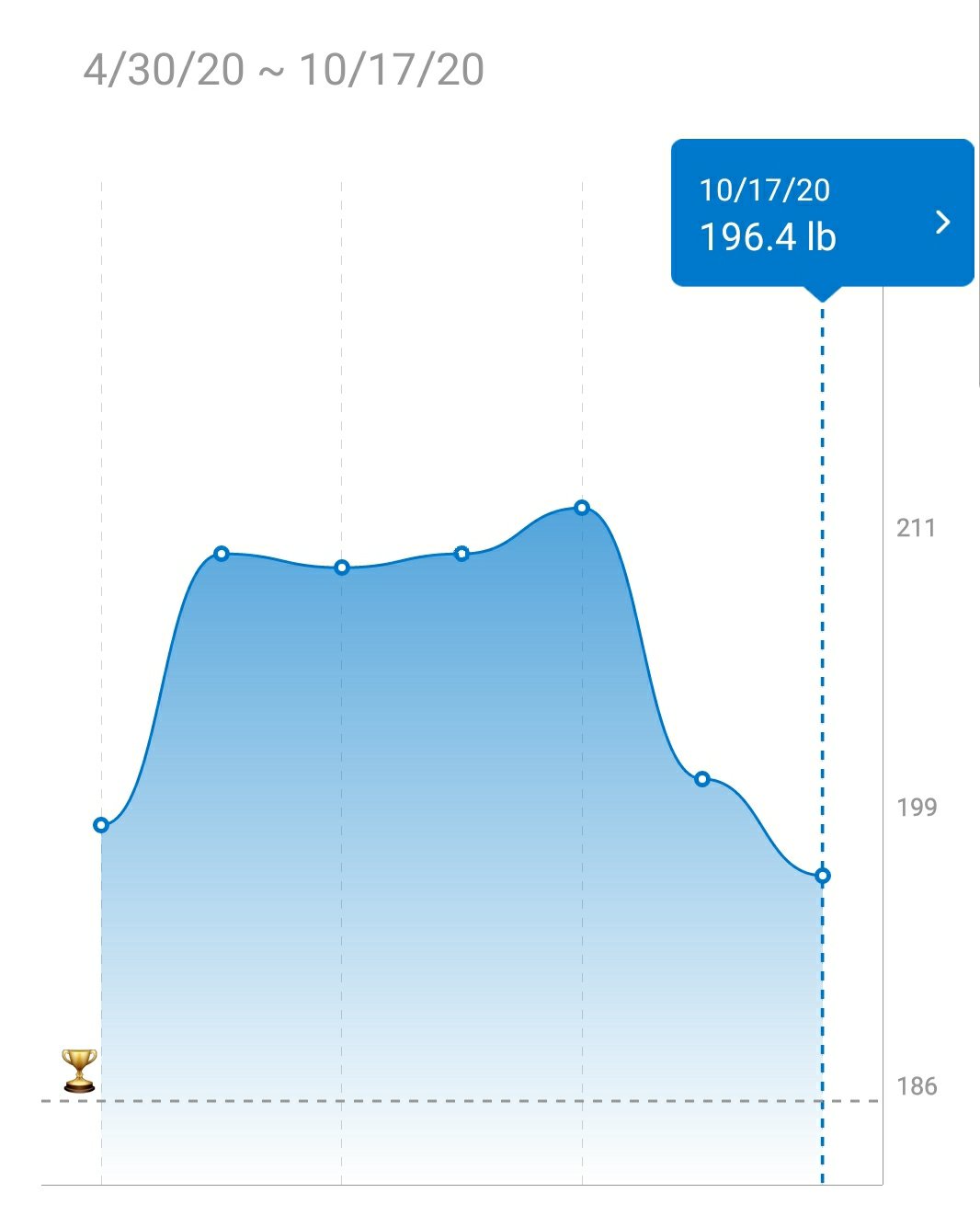 Today I hit 196.4 which is my lowest since returning to the US. My goal remains 185 and my hope is with regular exercise I can eat a more balanced diet.