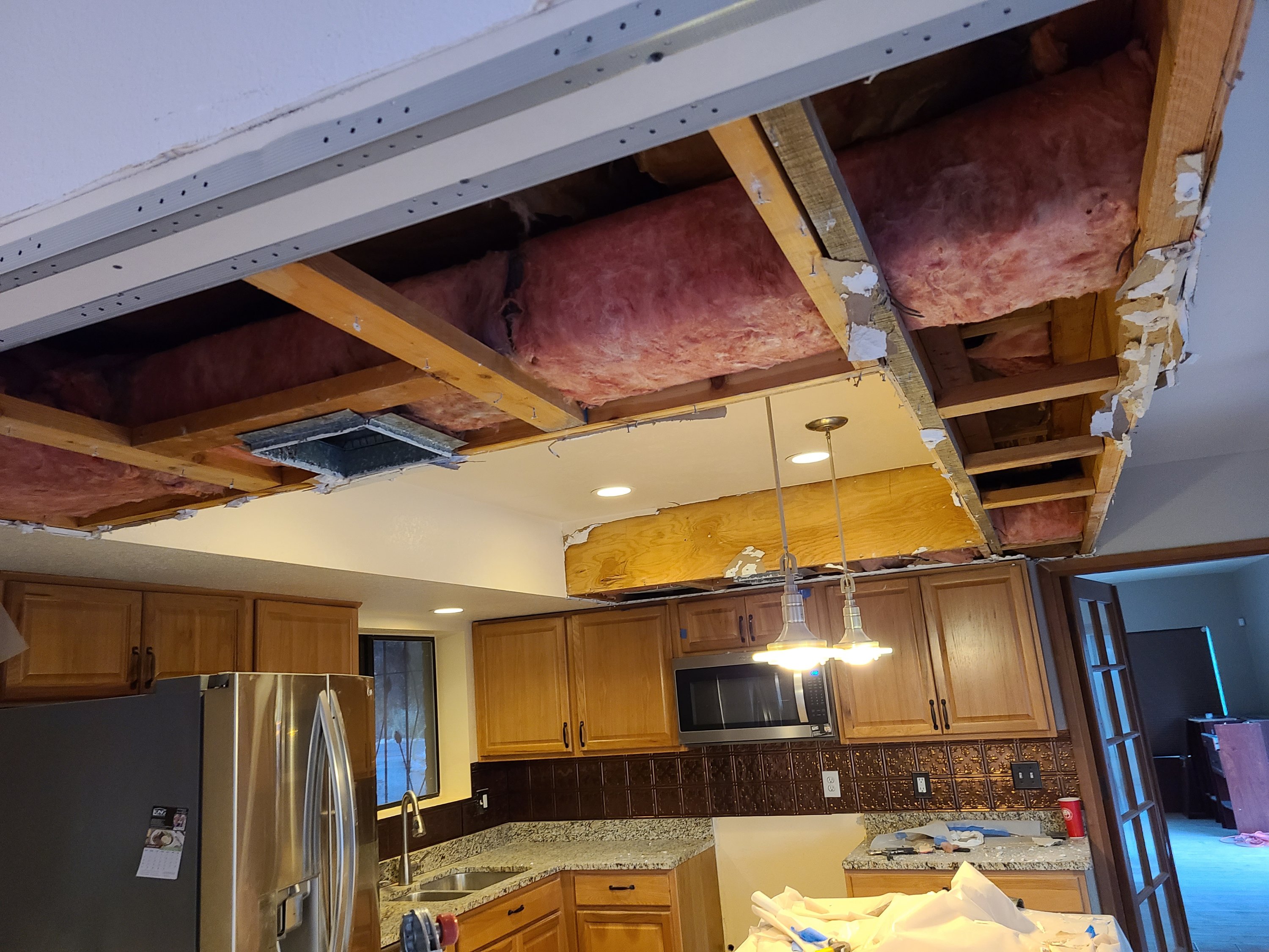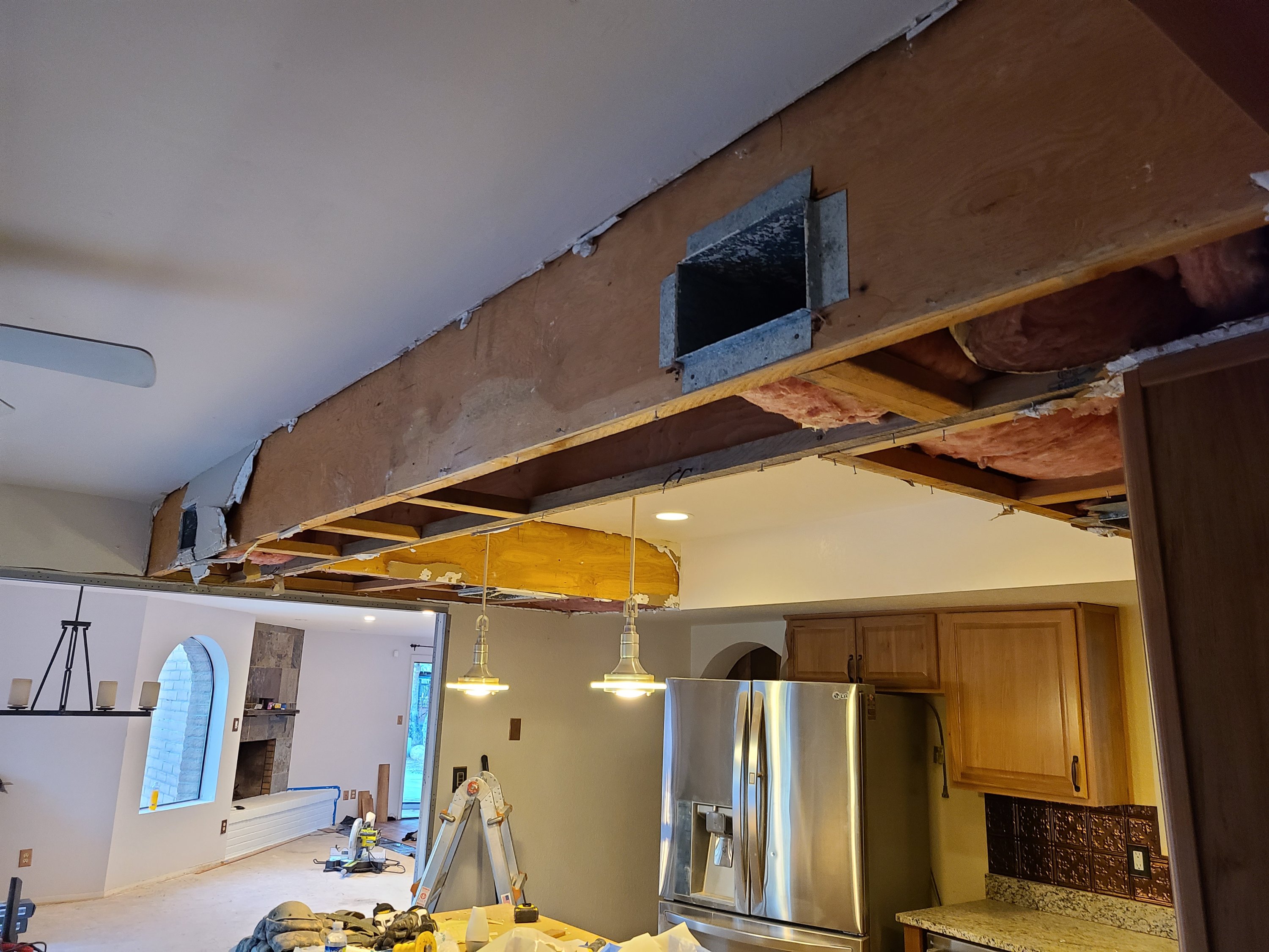Yesterday Matt and I destroyed the kitchen soffit. It was a hideous remnant from the 70s that needed to go. I need a demolition saw to cut out that framing and then I can remove the duct work. We don’t need that many vents in the kitchen, so we will reduce it to one next to the fridge (and above where the new pantry door will go).
