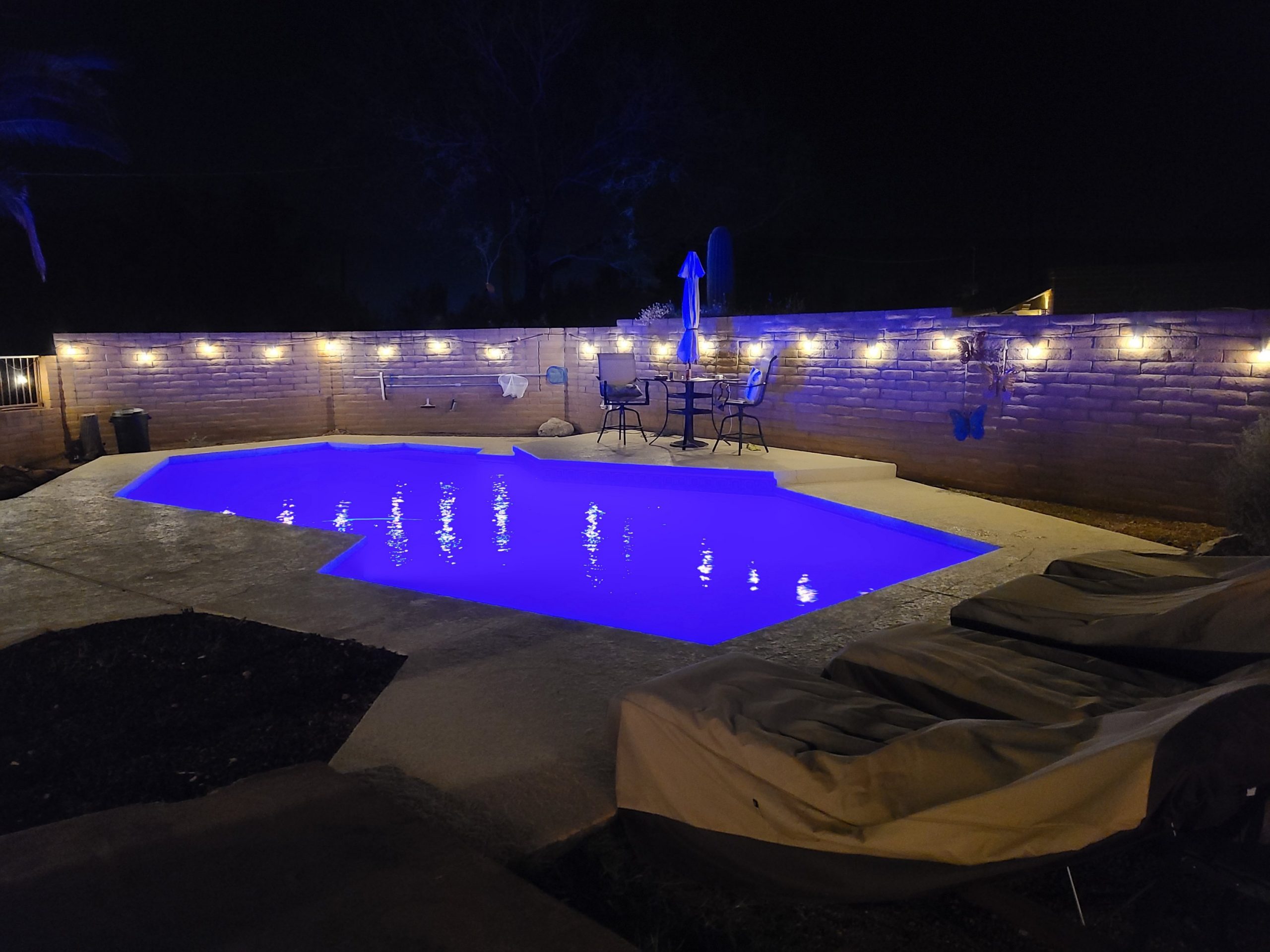 The pool is so blue at night! We still have to refinish our pool deck and then paint the walls, but it is all coming together slowly. We may add a pergola over our loungers and a few sun shades on the other end to provide some relief from the blazing sun.