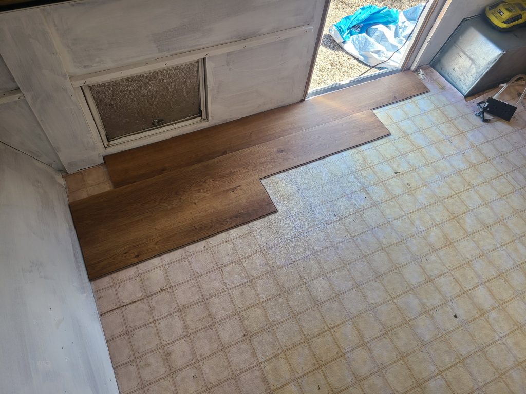 Once everything was out – I primed the interior walls and then began to lay the floors. I have a surplus of vinyl planks from the house, so I just used those. They worked great and it really wasn’t that many cuts.