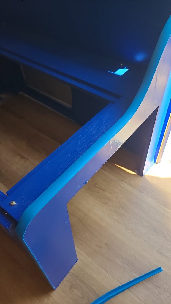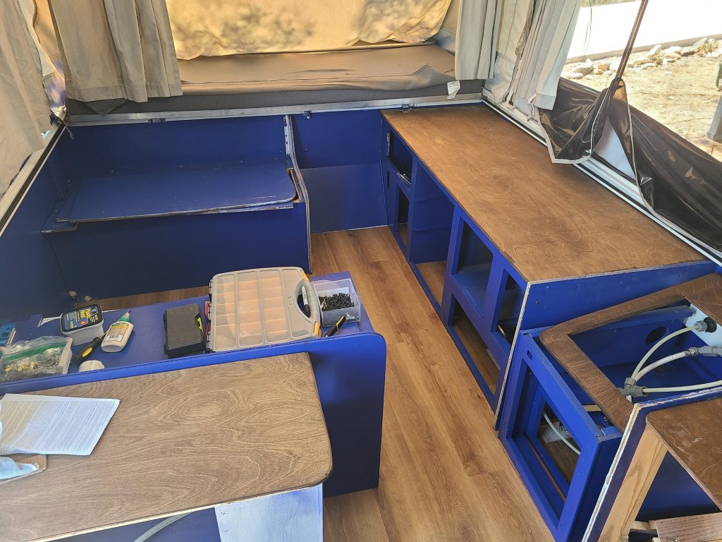Once the floors were in, the primer was dry enough to go ahead and paint the interior the blue I found. This seemed like a better solution than white (which most people seem to prefer) as it should be more forgiving with keeping it look clean.