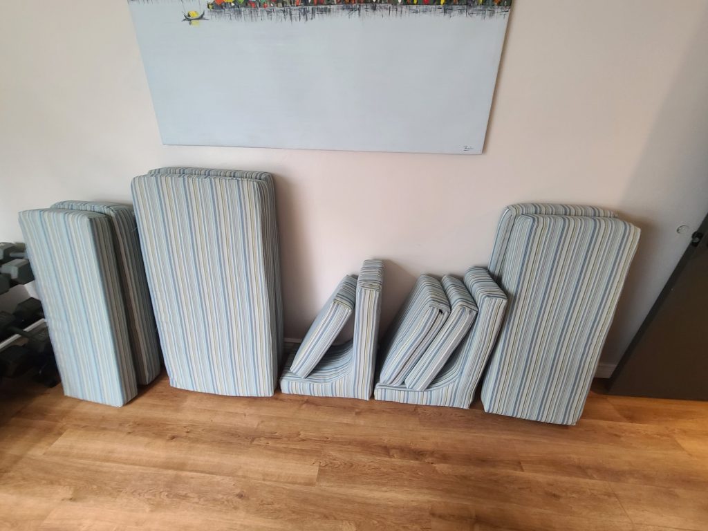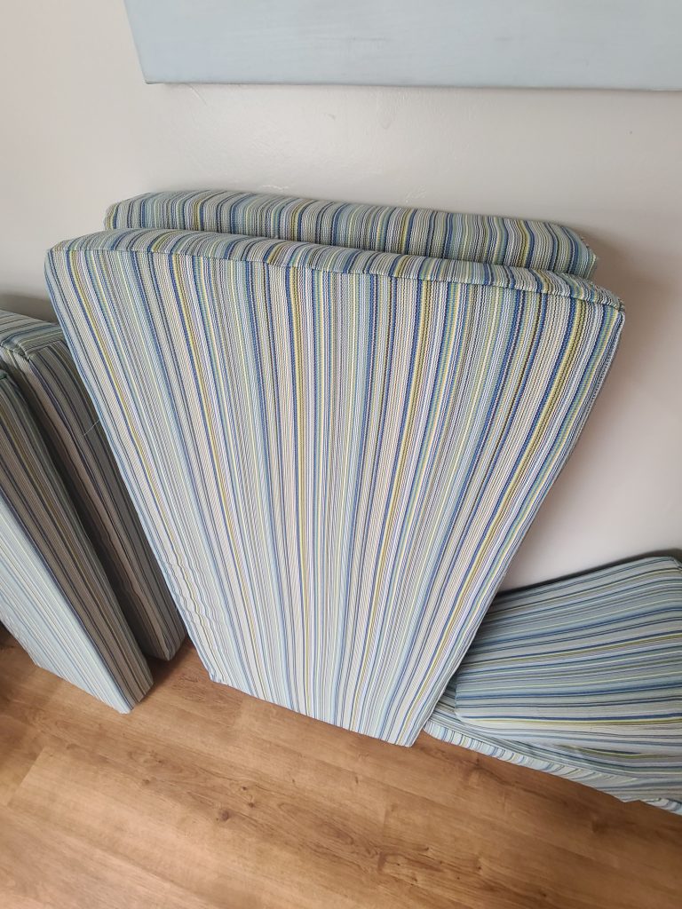 My favorite part was reupholstering the cushions. Ana and Yun worked on those and did a spectacular job – though it took a lot of work. We removed the old zippers, washed them, and reinstalled them on the new. In retrospect, I probably should have bought new ones for a few dollars rather than the hours it took to get the old ones out.